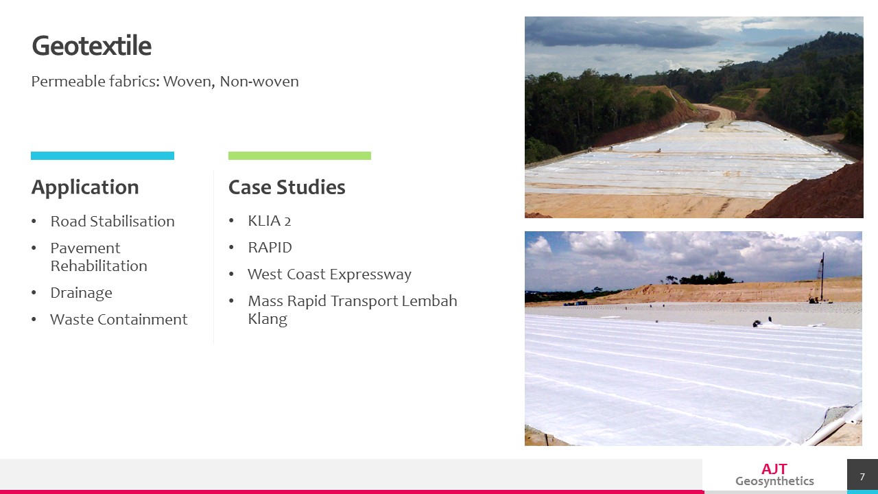 Some of our past projects are the installation of PVD, Woven Geotextile and Non-woven Geotextile in the new airport (Kuala Lumpur International Airport 2, KLIA 2 @ Low-cost carrier terminal (LCCT) and South Klang Valley Expressway (SKVE).